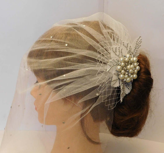 Birdcage veil. White, Ivory bridal veil Bridal Lace fascinator Diamonte Pearl Blusher veil, wedding hair accessory Bridal Bird cage veil