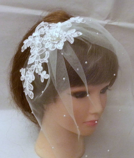 Bridal Birdcage veil White, Ivory bridal veil Bridal Lace fascinator Diamonte Pearl Blusher veil, Wedding hair accessory -EleganceFascinator