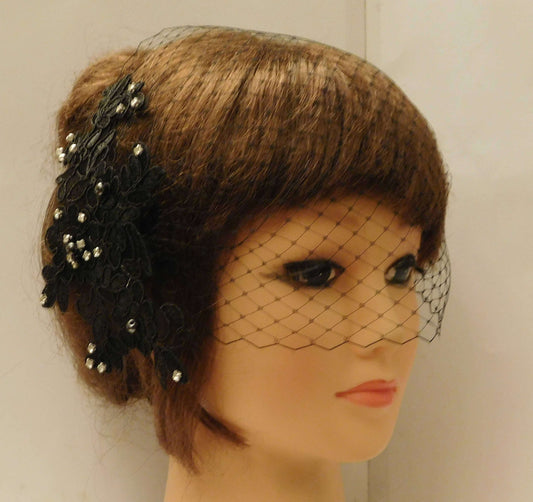 Black Birdcage veil Blusher Veil. 9 inch Bandeau veil with crystals and pearls flower motif lace fascinator, Ladies black veil for ceremoney