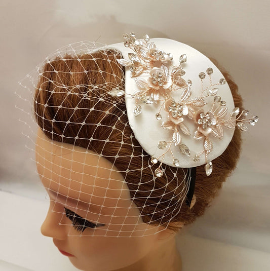 BRIDAL FASCINATOR hat Champagne wedding #fascinator bridal hair accessory 2Pc set Mini Bridal birdcage veil & hat Bridal Hat fascinator