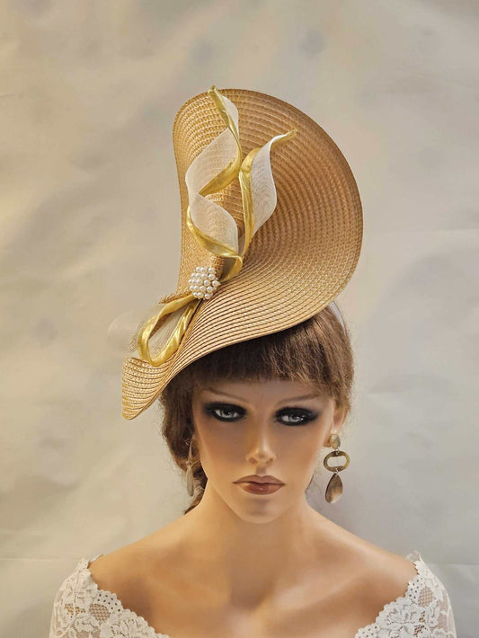 Wide Gold Fascinator Hat with Crin Swril & Pearl Cluster Statement Woven Chic Mustard Gold Hatinator for Wedding,Derby,Mother of bride Hat