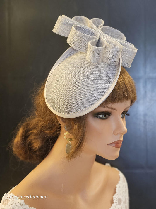 SILVER Grey fascinator Saucer hatinator Sinamay bow. Church Derby Ascot Royal Wedding TeaParty hat Mother of Bride/Groom hat Facinator