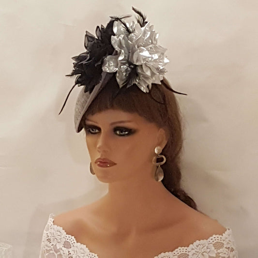 SILVER GREY FASCINATOR Hat 40s 50s Hatinator #Silver & Black Floral Feather fascinator hat Race Ascot hat feather flower Ladies saucer hat