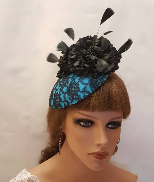 TURQUOISE BLUE & BLACK Hat Fascinator Beautiful Black lace covered blue hat Wedding Ceremoney Hatinator Cocktail Ascot Party Hat Fascinator