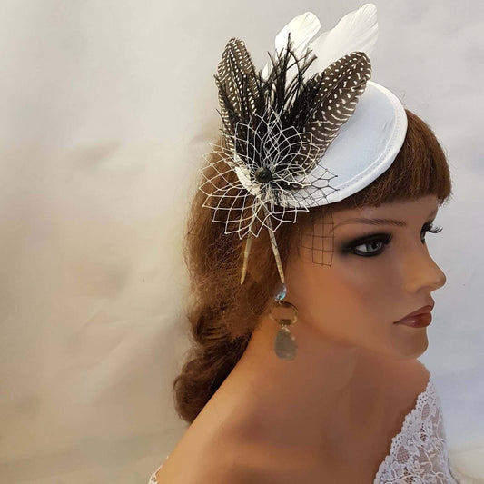 WHITE HAT FASCINATOR 40s 50s #Black & White Hat Fascinator Ostritch Feather Spotty Feather Hat Race Cocktail Ladies day Ascot Hat Fascinator
