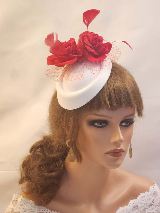 WHITE hat FASCINATOR with RED roses. Wedding,Church hat fascinator Goodwood, Kentucky derby Cocktail,Ascot,Prom Fascinator. Pillbox felt hat