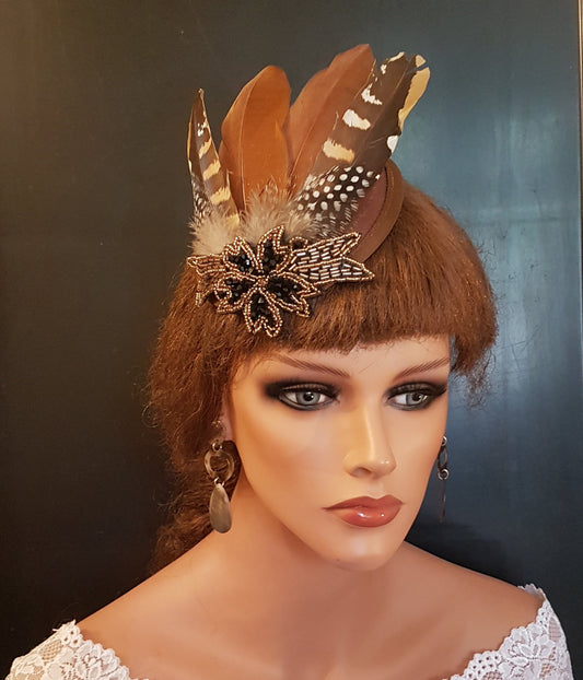 BROWN HAT FASCINATOR #Hat Fascinator. Crystal Beads jewel and Brown Feather Hat Fascinator, Race, Cocktail Ladies day, occasion pilllbox hat