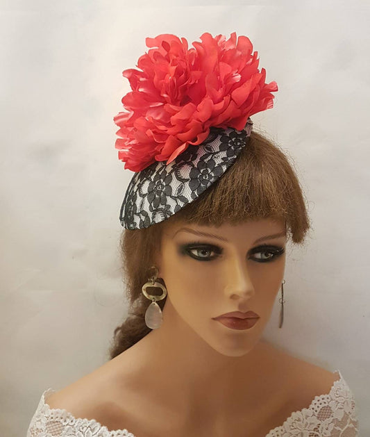 BLACK, WHITE & RED hat fascinator Large Red Peony Flower. Black Lace hat. Wedding, Race, Ceremoney Hatinator Cocktail Ascot Hat Fascinator