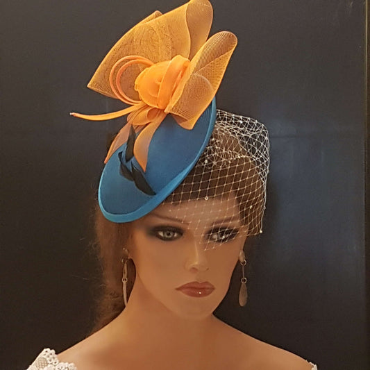 Hat fascinator Teal blue & Orange Hat, Blue Fascinator hat veil fascinator Race Cocktail hat Ascot Hat, Cocktail hat, wedding Race headpiece