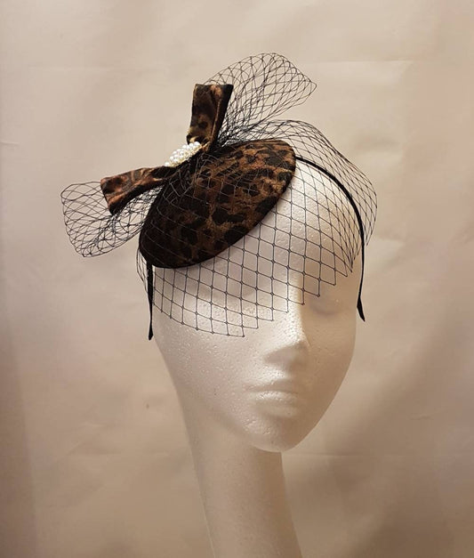 Lady Womens Dress Fascinator Velvet Hat Vintage 40s 50s Hat. Animal print Brown Hat fascinator birdcage veil Party Wedding ASCOT GOODWOOD