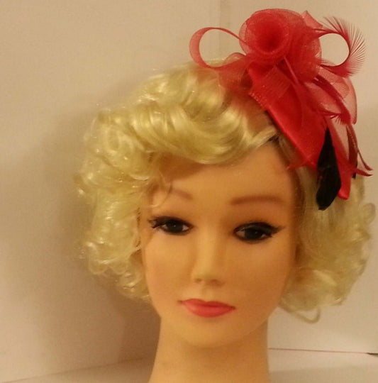 Fascinator hat, 40s 50s #RED Teardrop hat. RED & BLACK feather Fascinator Race, Cocktail party, Prom hat . Wedding feather fascinator