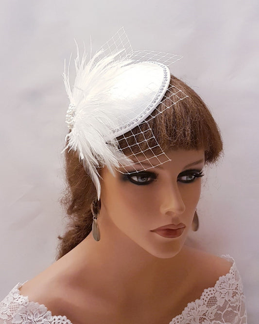 Hat fascinator Bridal fascinator #Feather hat fascinator White Ivory netting Wedding hair accessory