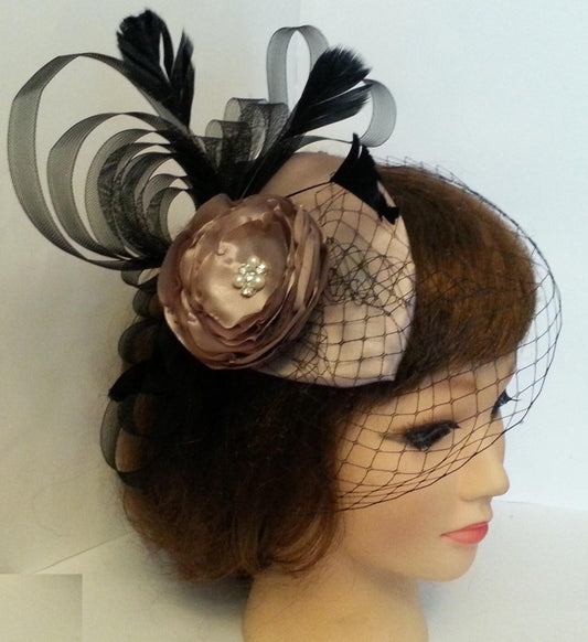 Champagne & Black TEAR DROP Hat fascinator veil Ladies Wedding,Cocktail,Race Royal Ascot hat Vintage hatinator Veil feather hat fascinator