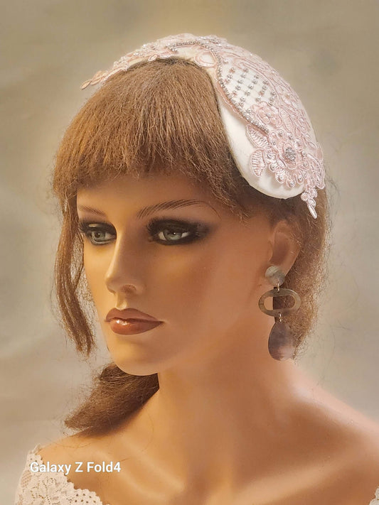 Bridal birdcage veil Hat fascinator White Ivory Champagne Pink hat with Pink motif. Bridal 2Pc set Veil & headpiece-ELEGANCEFASCINATOR