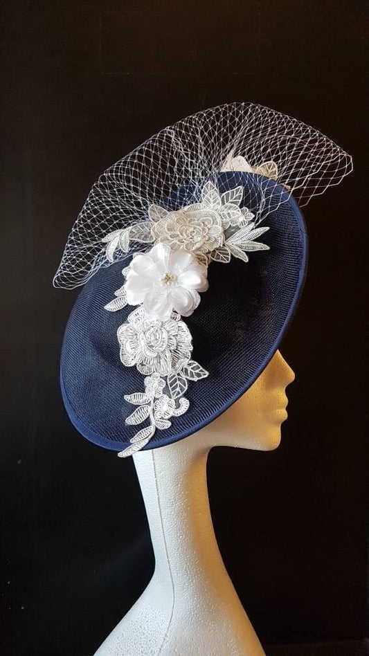 NAVY BLUE Hat FASCINATOR Wedding Mother of bride Kentucky Derby Royal Ascot Race Ladies 30cm Large Saucer Sinamay Hat Navy and Off white hat