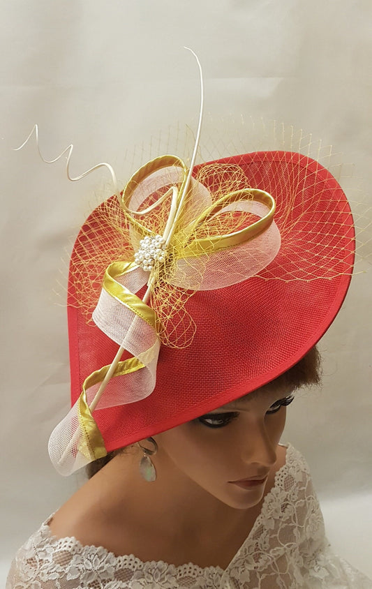 RED & GOLD Hat Fascinator Long Quill Feather Gold French Netting Wedding Ceremoney Hatinator Cocktail Ascot Mother of bride Groom Hatinator