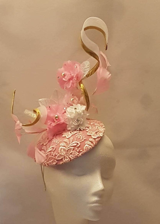 PINK HAT FASCINATOR with Gold edge swirl Wedding.Kentucky derby,Ascot hatiinator