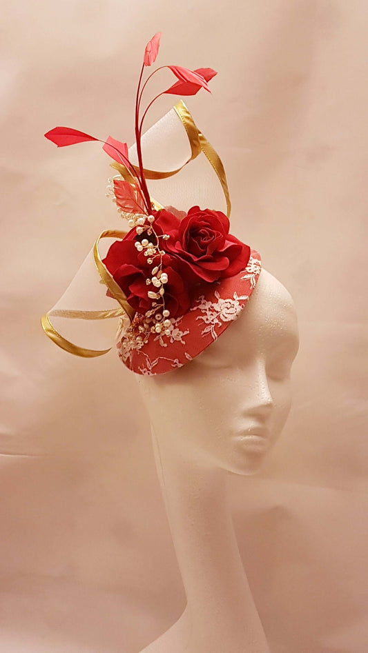 RED Fascinator Wedding Race Royal Ascot hat,ladies day out hat,Vintage inspired red feather fascinator hat Red GOLD edge Swirl Fascinator