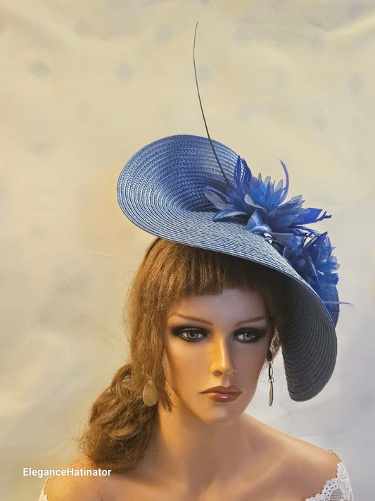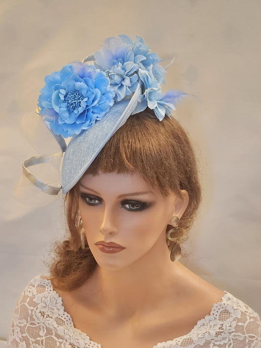 Blue Hat Fascinator Hat medium 20cm Saucer hatinator long Swril Floral Church Derby Ascot Wedding Party hat Mother of Bride/Groom Hatinator