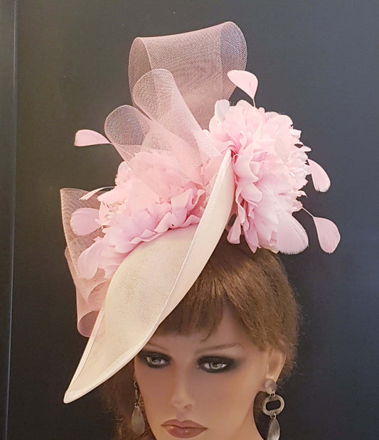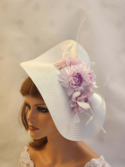 White & Pink Hat Fascinator Large hatinator with Feathers. Floral Church Derby Ascot Race Wedding Party hat Mother of Bride/Groom- EleganceFascinator