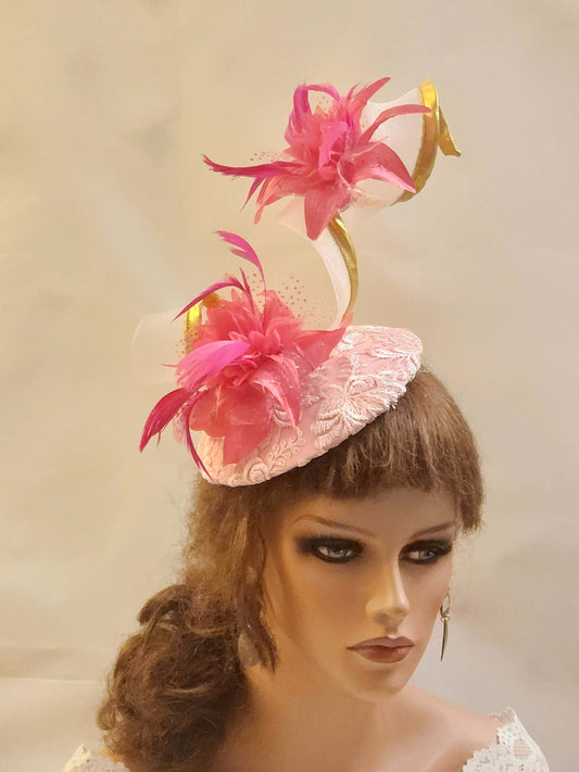 PINK HAT FASCINATOR with Gold edge swirl Wedding.Kentucky derby,Ascot hatiinator
