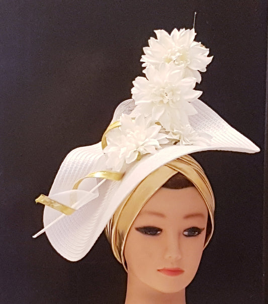 WHITE & GOLD Fascinator hat Quill Feathe, Gold Edge Crinoline Swril Hatinator Wedding,Race,Ladies,Formal, Occasion,Ascot,party hatinator