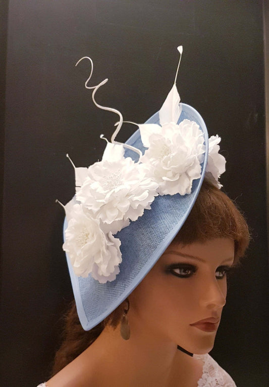 WHITE/ BLUE Fascinator Hat WHITE Teardrop hatinator long Swril Floral Church Derby Ascot Wedding Party Mother of Bride/Groom Fascinator Hat