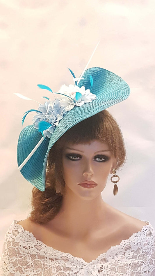 WHITE & BLUE Wide Hat Fascinator with Flowers and Feathers. Stylish Headpiece Weddings,Formal Events, Party Headpiece