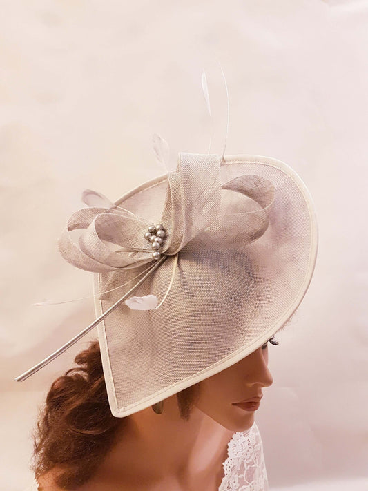 Pale Grey fascinator large Tear drop hatinator long Quil Floral Church Derby, Ascot, Wedding Party hat Mother of Bride/Groom Hatinator