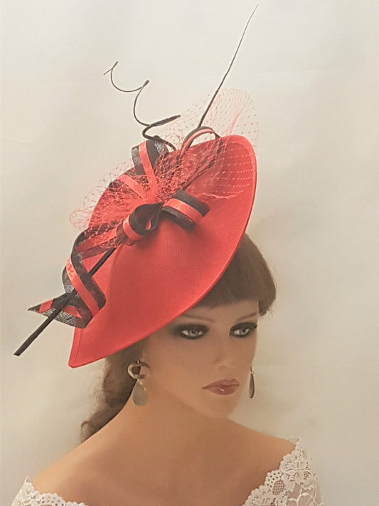 RED Fascinator Hat Long Quil Feather French Netting hair accessory Wedding Ceremoney Ascot Race hat Mother of bride/Groom Fascinator Hat
