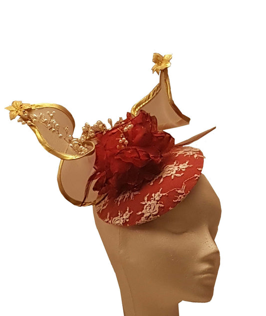 Fascinator hat, Wedding, Kentecy derby, Royal Ascot hat, RED Feather fascinator hat, GOLD edge Swirl Ladies Hat with Crystal Pearl Vine