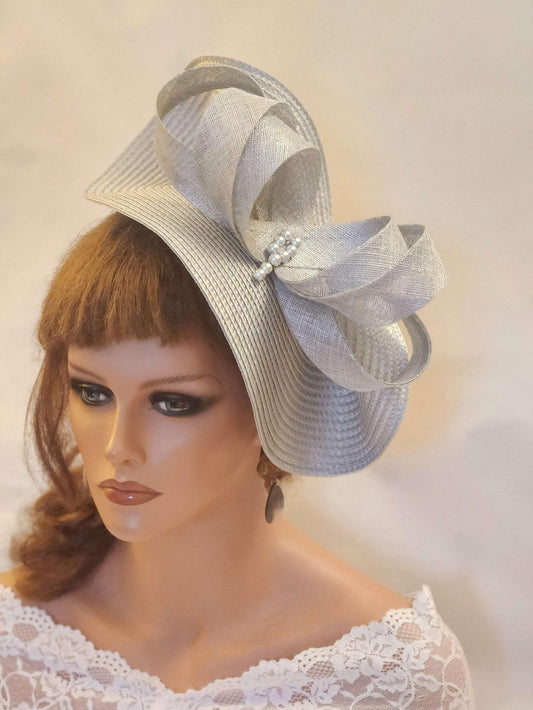 Elegant Metallic Silver Wide Fascinator Hat with Feather,Pearls,Bow.Sophisticated Headpiece Wedding,Mother of bride hat,Statement Accessory