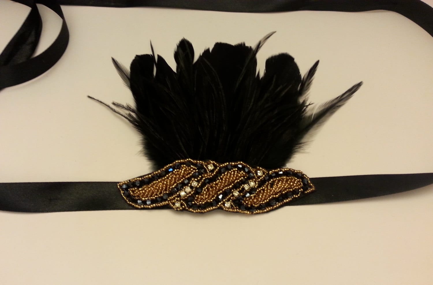 Coiffe des années 1920. Bandeau de front pour bal de promo de mariée, accessoire pour cheveux Great Gatsby, magnifique coiffe vintage en perles et plumes noires et dorées.