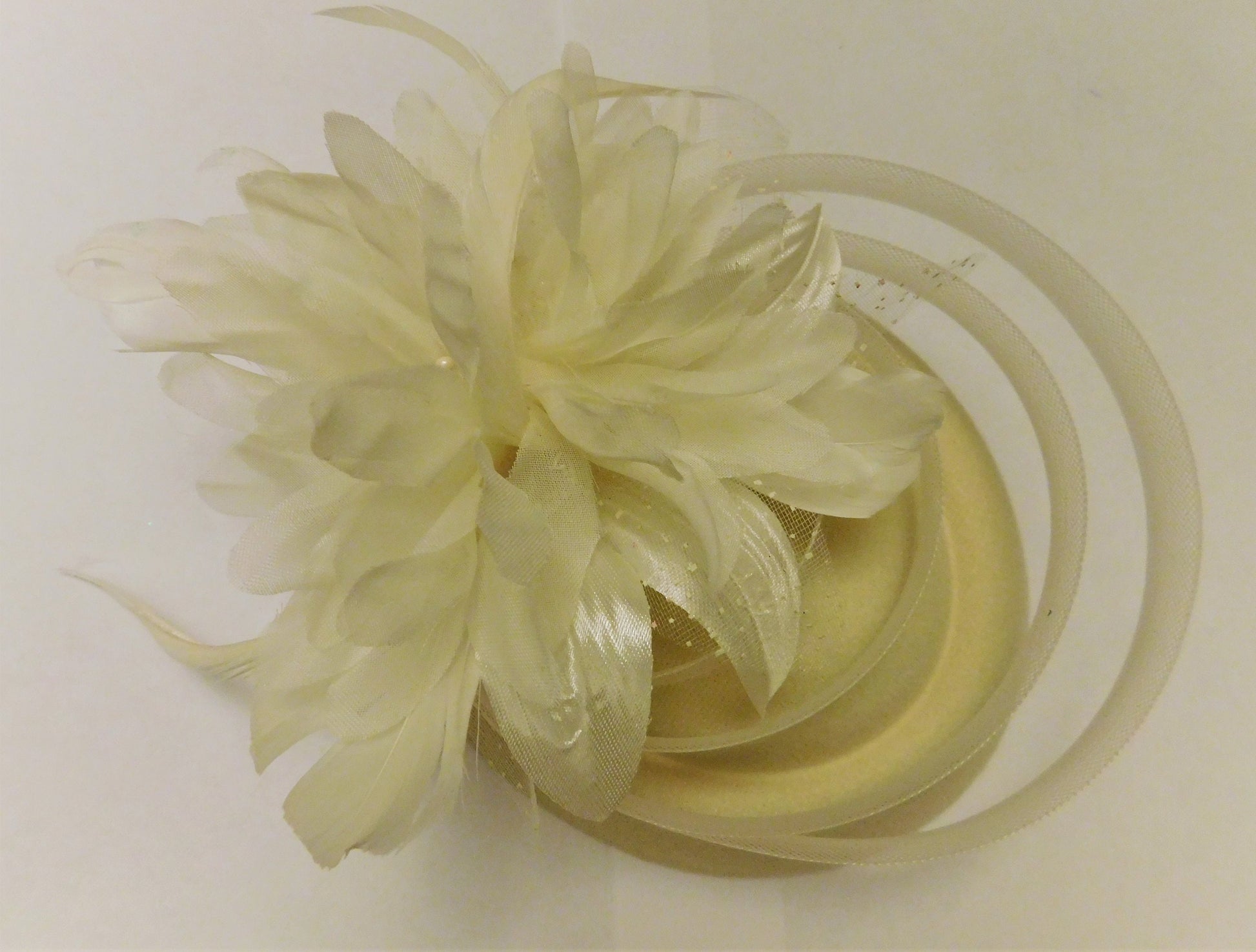 Magnifique chapeau fascinateur en forme de larme. Chapeau fascinateur ivoire avec fleur en plumes ivoire et boucles en crinoline.