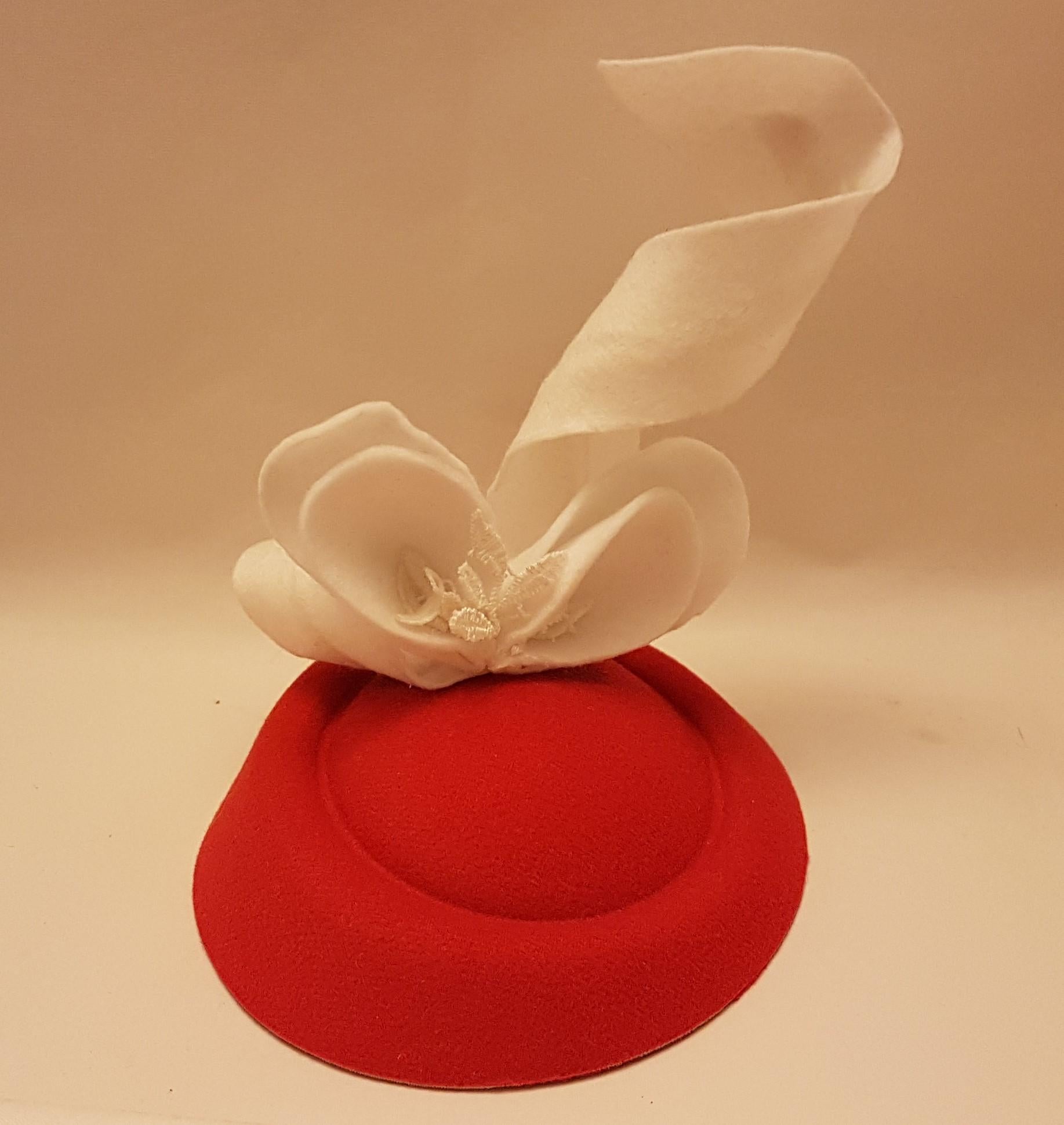 **Design unico**: il fascinator presenta un vortice scolpito in feltro rosso che si fonde armoniosamente con delicate foglie bianche, creando un contrasto sorprendente che non mancherà di attirare l'attenzione.