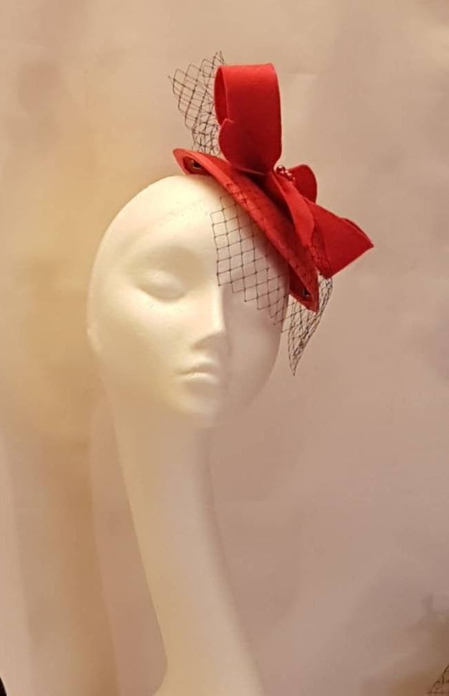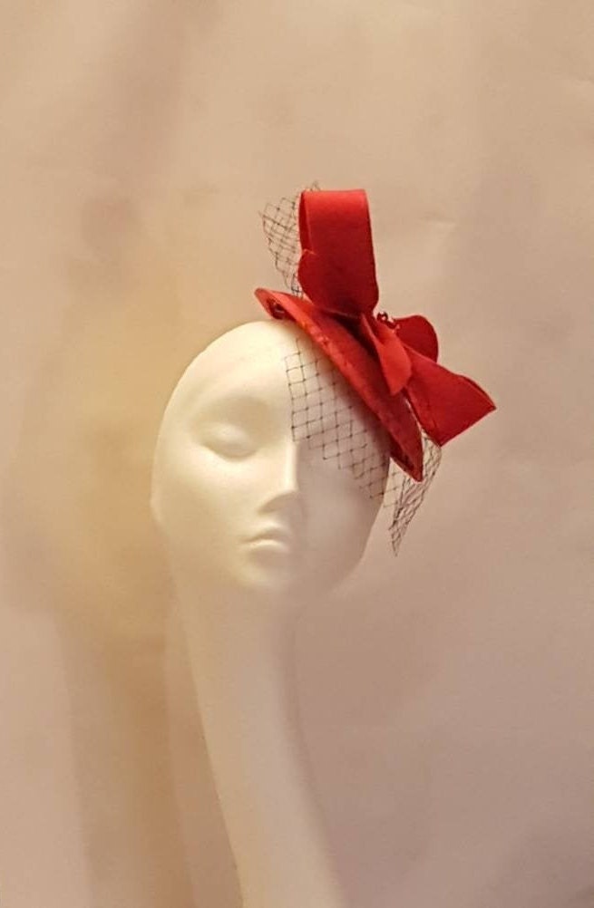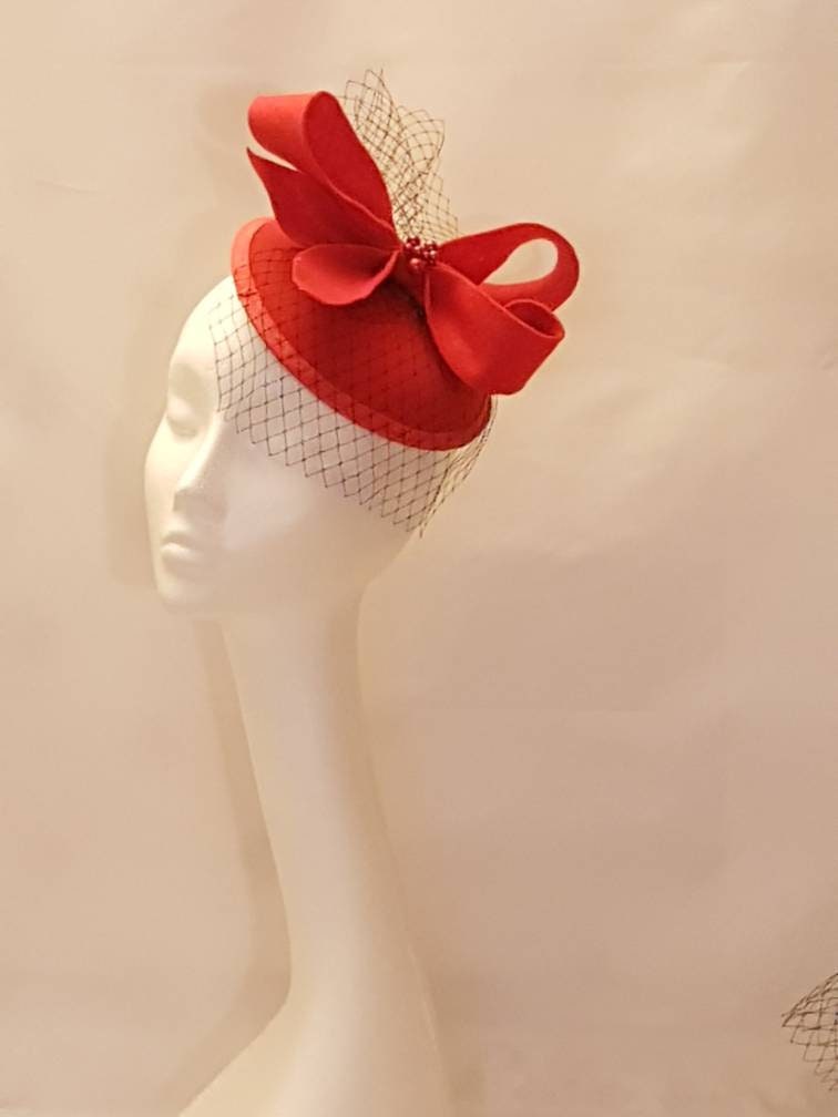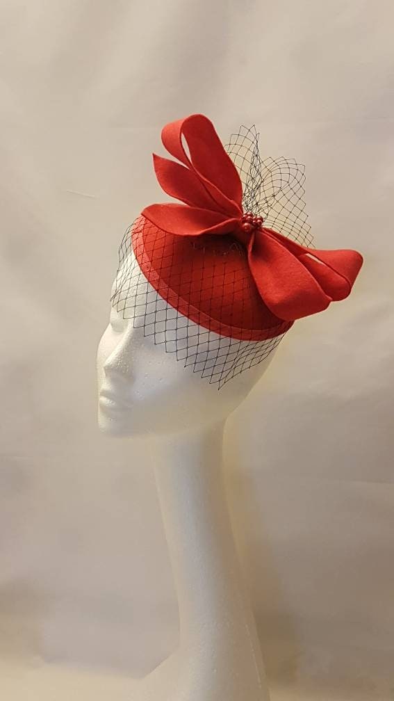 Cappello rosso in feltro con fiocchi in feltro, perline e mini velo a gabbia per uccelli NERO. (Se preferisci lo stesso colore del velo, aggiungi una nota al momento del pagamento)