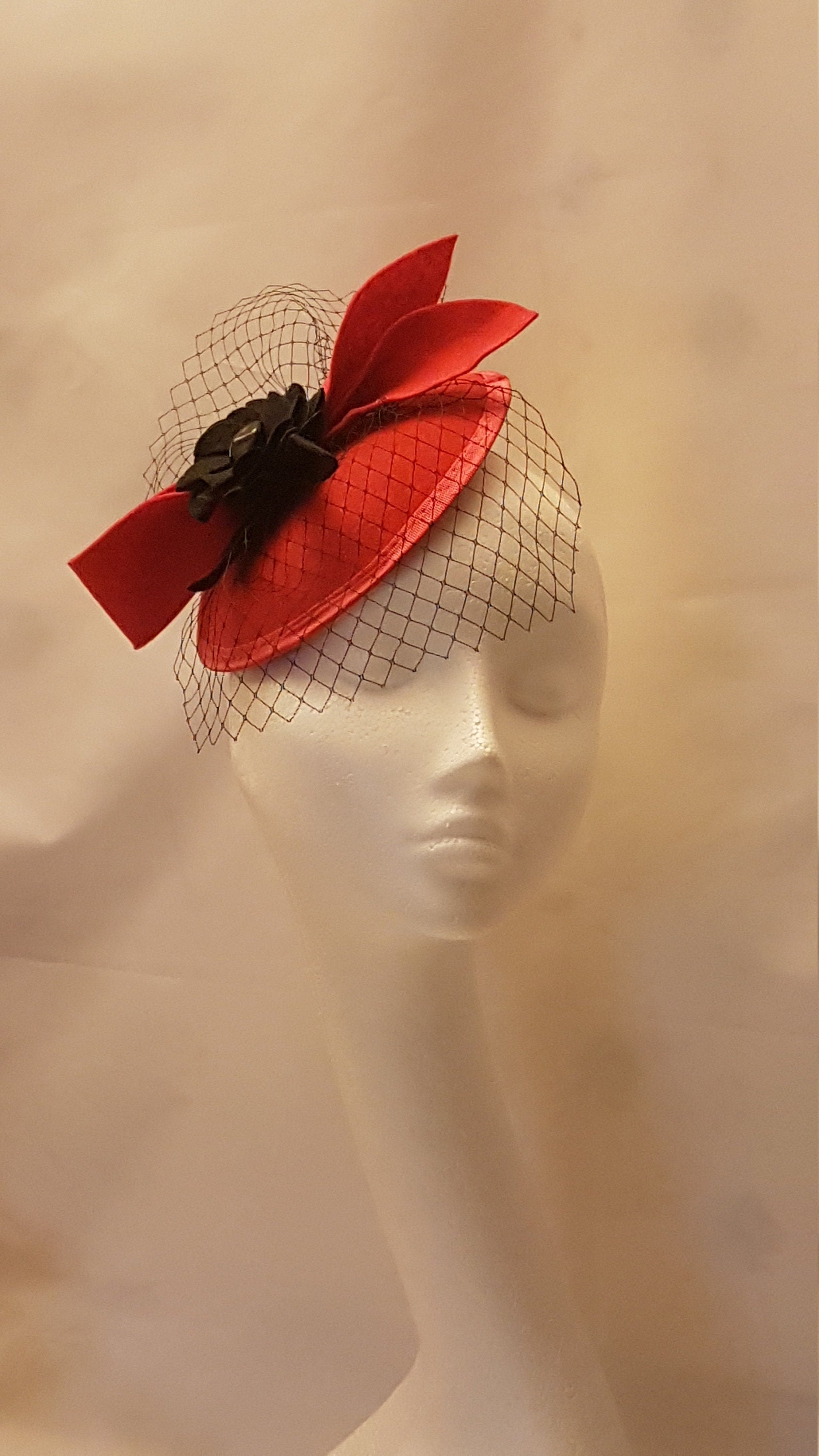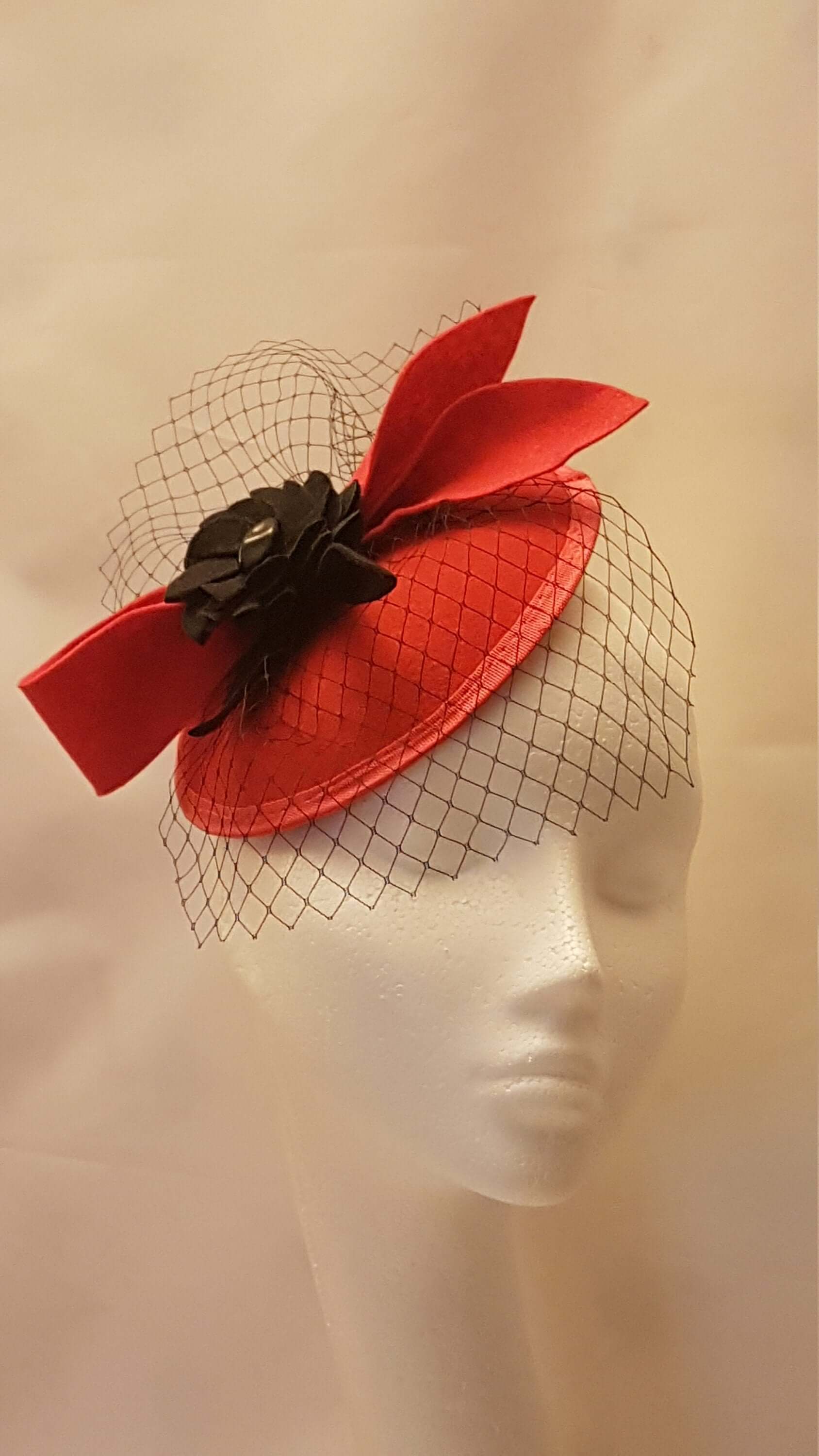 Cappello in feltro rosso con fiore in feltro nero decorato con una bella perlina nera e fiocchi in feltro rosso e nero. Viene fornito con mini velo nero o rosso o senza opzione velo