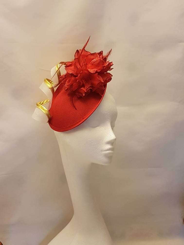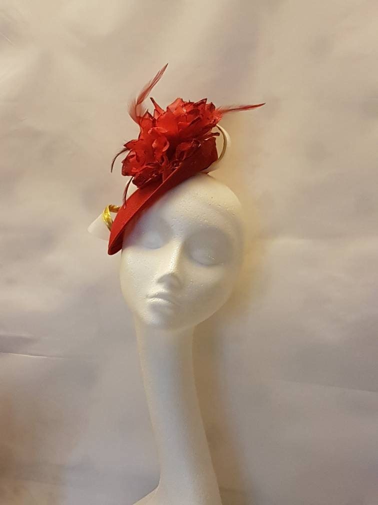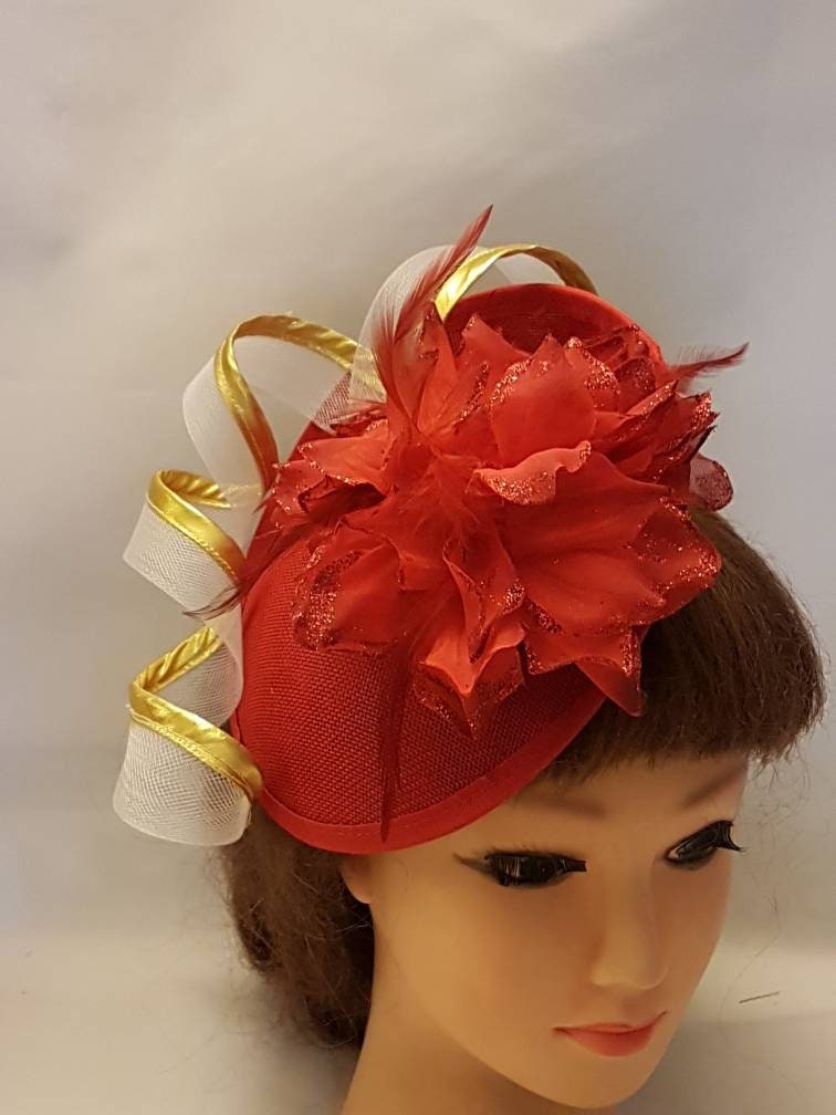 Fascinator CAPPELLO ROSSO, #fascinator cappello ROSSO, cappello da chiesa per matrimonio, cappello fascinator, cappello da cocktail Ascot di Goodwood cappello con piume, bordo dorato a spirale
