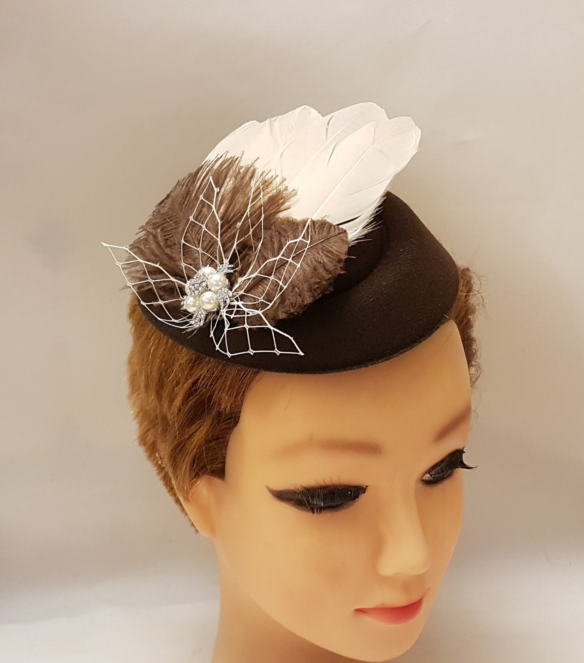 Gorgeous Hat fascinator. NUDE PINK Feathers with Dark Brown Ostritch feathers. Hat Fascinator with Feathers, crystal and pearl jewel & French netting detail