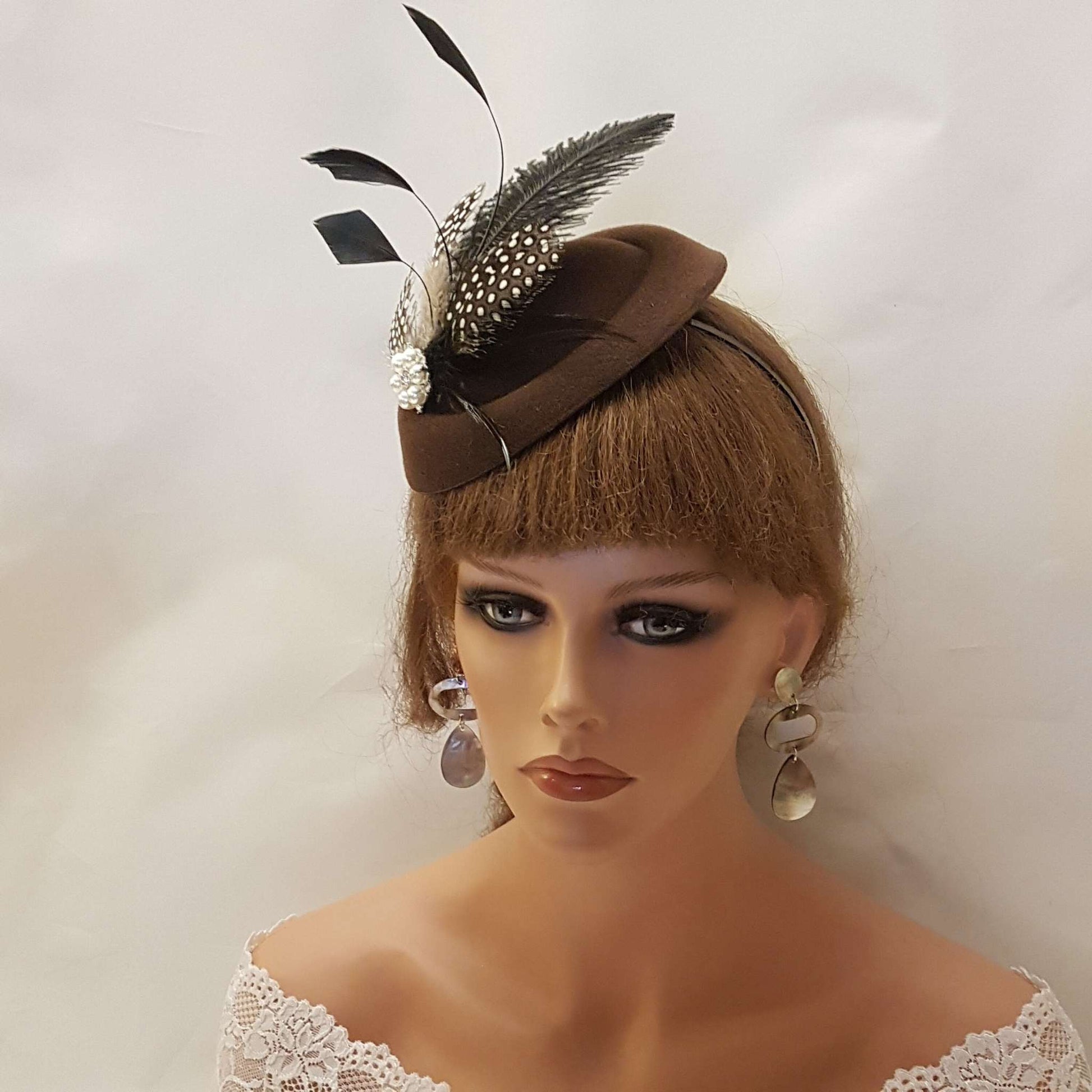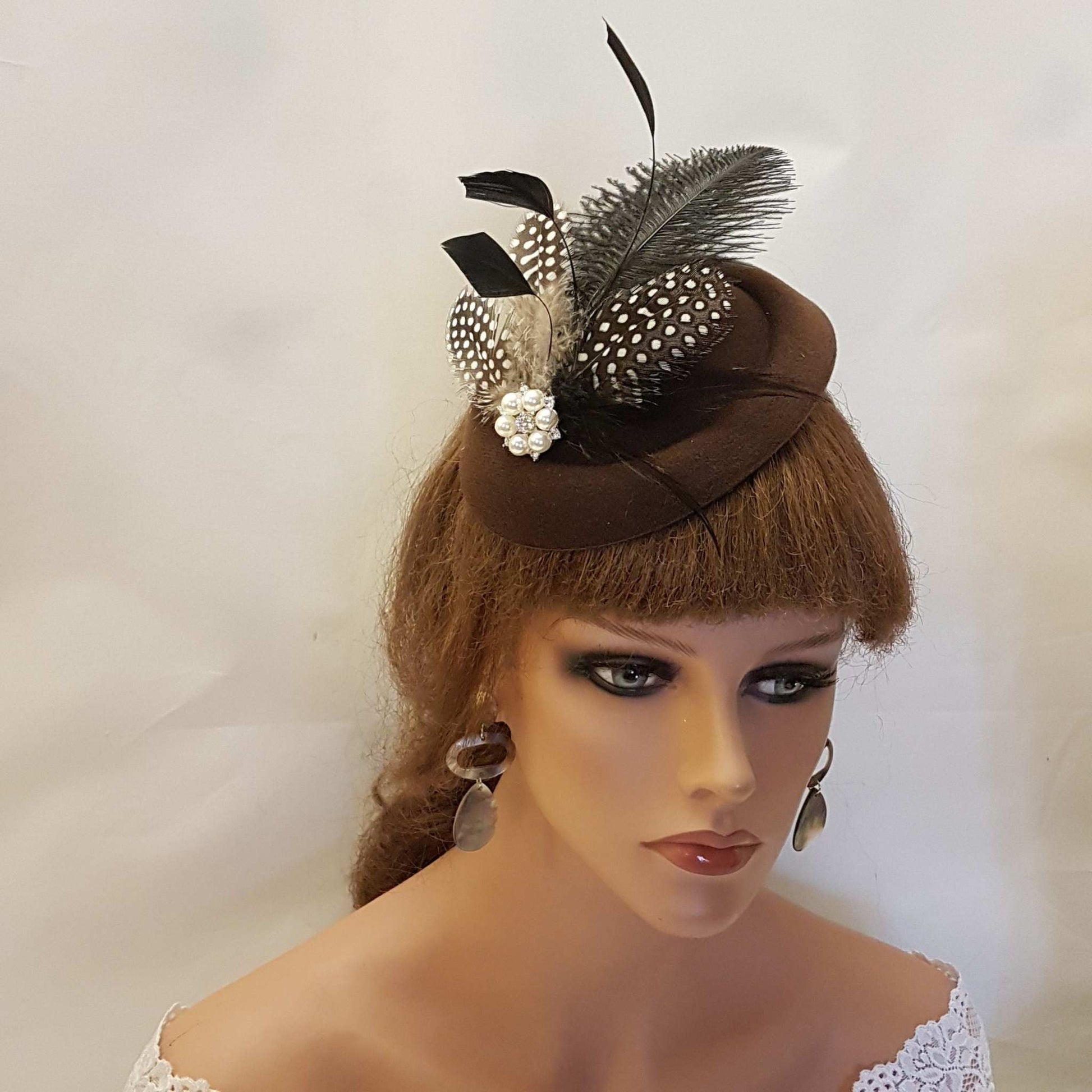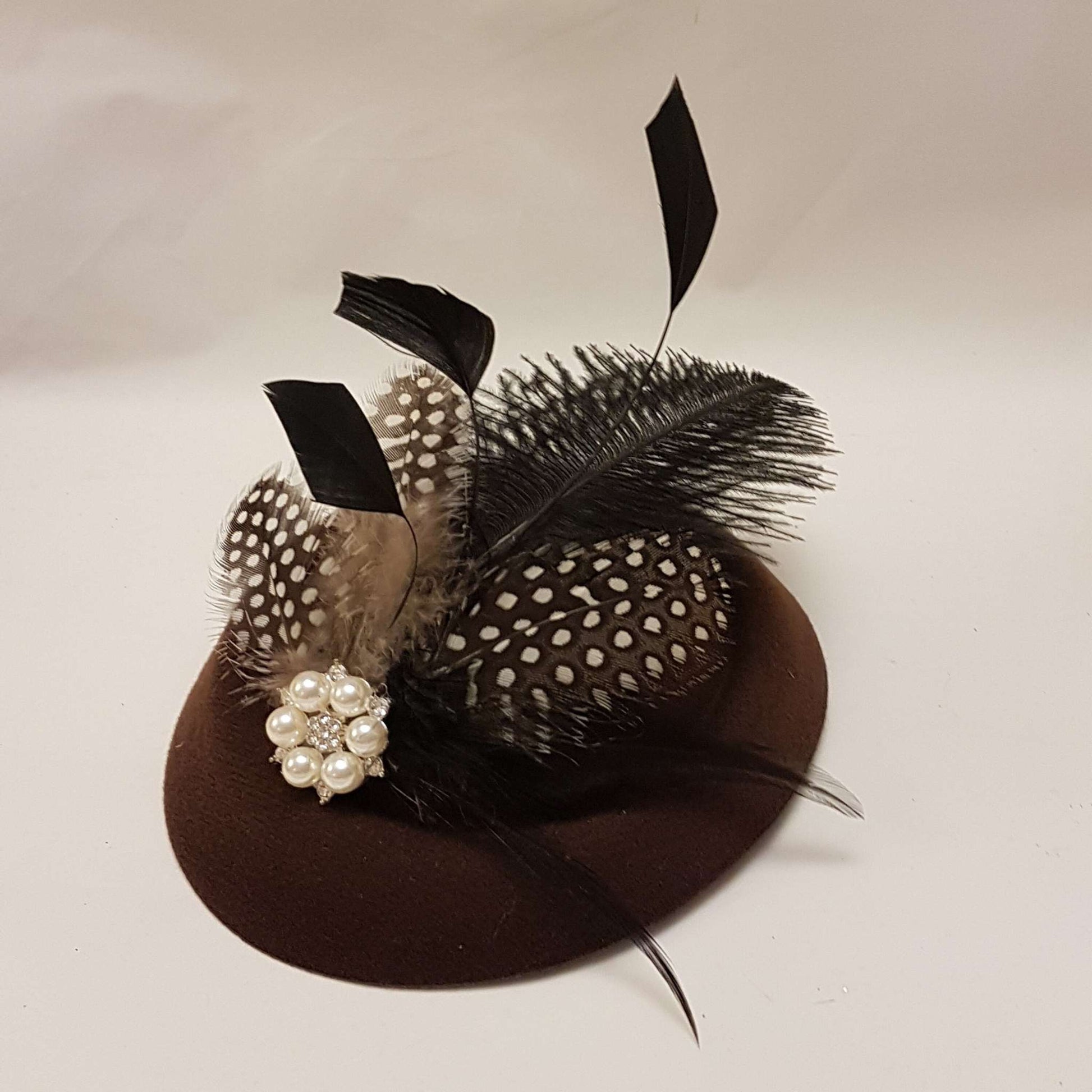 Fascinator, Hat fascinator Cocktail, Wedding,Kentucy Derby, Ascot fascinator,Vintage inspired hat fascinator. Wedding, Goodwood revival, Christening, Ascot, Prom , Special occasion hat Party etc..., Gorgeous Hat fascinator. BROWN Hat Fascinator with mix of Feathers This Felt like hat has been made by hand and very light to wear. with beautiful feathers. Might have slight colour differences as these are made by hand. Hat Fascinator With assorted feathers of Ostritch and beautiful touch of Natural Guinea Fowl Spot Feathers and rooser feathers and a sparkling Pearl/ rhinestone jewel. Attachment option: Aligator clips with teeth Headband or Comb Hat size - approx 6 inch around This can be worn from centre to a side part or middle part or across the head or even with a birdcage veil. Options are endless with one of your own styles. Perfect for wweddings races, and ceremonies This is available mostly other colours.