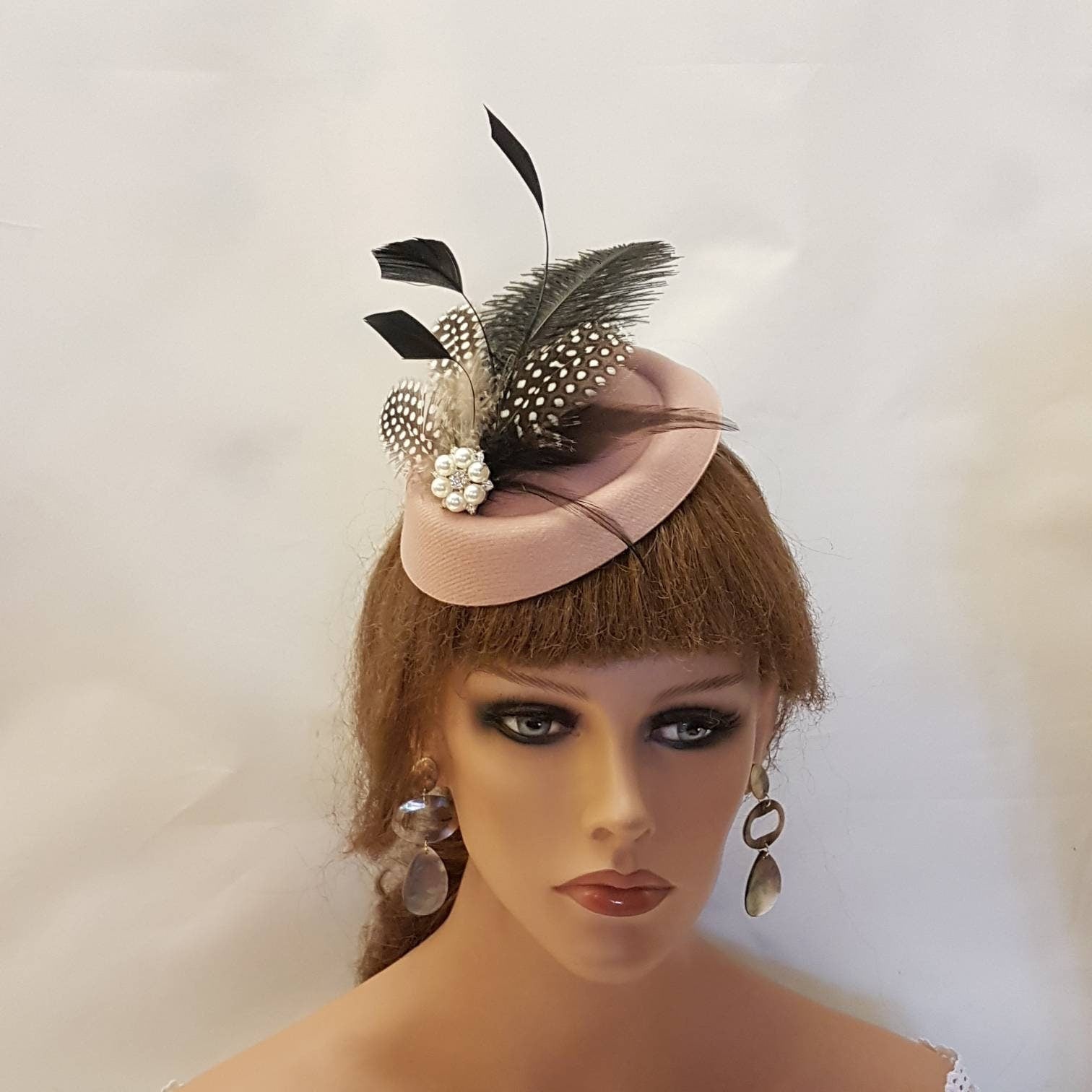Fascinator, Dusky pink/ Blush pink Hat fascinator Cocktail, Wedding,Kentucy Derby, Ascot fascinator,Vintage inspired hat fascinator. Wedding, Goodwood revival, Christening, Ascot, Prom , Special occasion hat Party etc..., Gorgeous Hat fascinator. Hor pink Hat Fascinator with mix of Feathers This hat has been made by hand and very light to wear. with beautful feathered flower.Flowers might have slight colour differences as these are made by hand. Hat Fascinator With assorted feathers of Ostritch ,and beautiful touch of Natural Guinea Fowl Spot Feathers and rooser feathers and a sparkling Pearl/ rhinestone jewel. Attachment option: Aligator clips with teeth Headband or Comb Hat size - approx 6 inch around This can be worn from centre to a side part or middle part or accross the head or even with a birdcage veil options are endless with one of your own styles. Perfect for wedding , Race and ceremonies This is available mostly other colours. Please click the link below