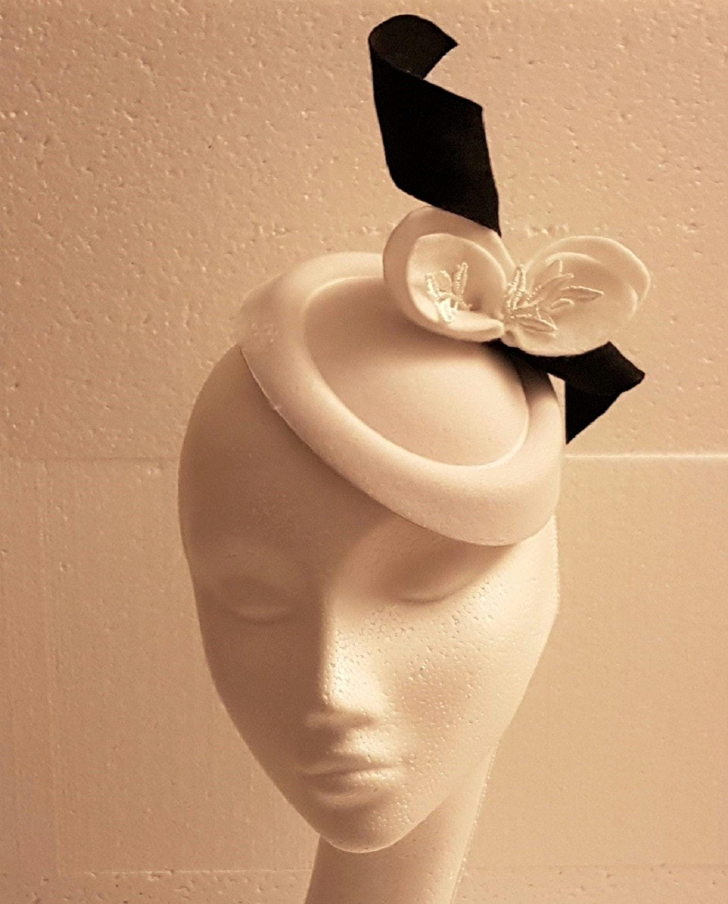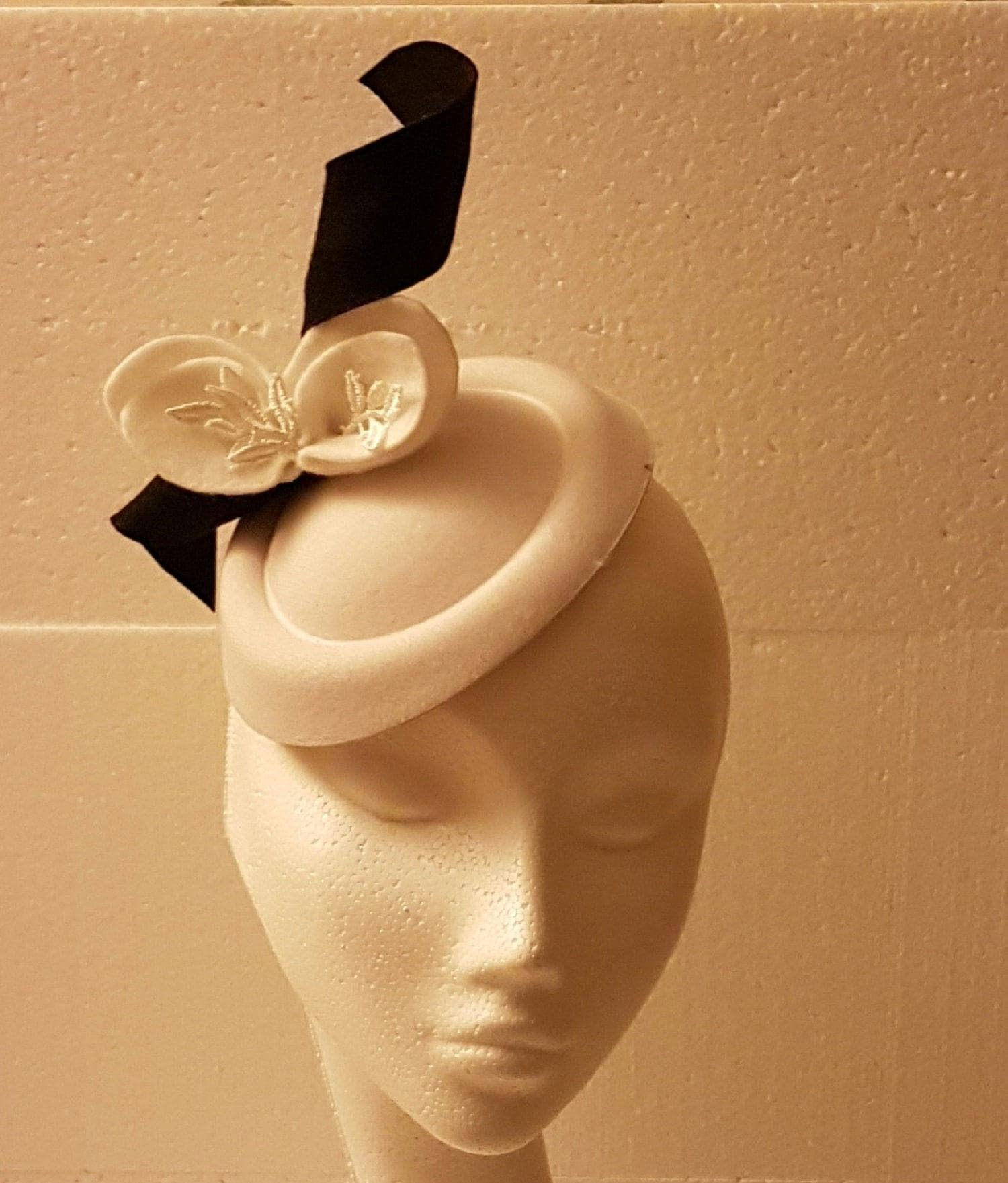 Fascinator Hat White Hat fascinator Black and White pillbox headdress with felt leaves for Ascot, Wedding, Race,Cocktail,Church headpiece