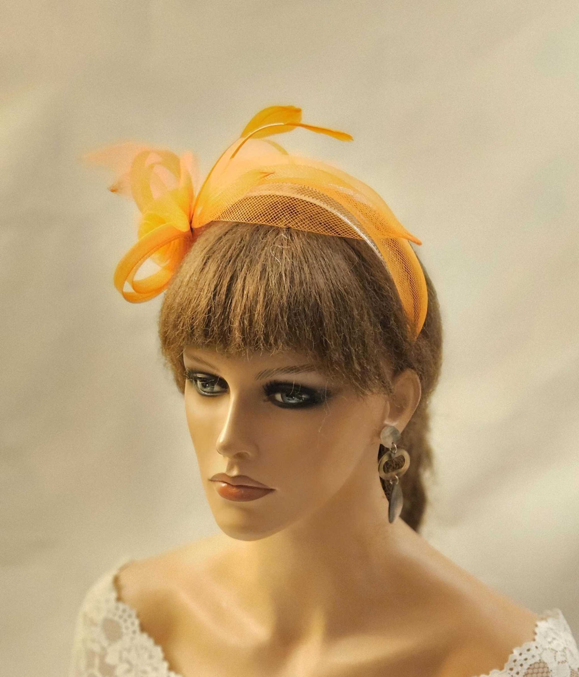 ORANGE Wedding Fascinator. Crinoline headband headdress. ORANGE wedding headpiece with a Unique stunning 1950's vintage style Crinoline fascinator hair piece, with a Modern touch. This is a truly unique stunning piece and a new arrival. An amazing eye turner headpiece with feathers & Crinoline mini Roses Leaves and loops. The headpiece has been mounted on a Headband It is perfect for wedding guest, Mother of the bride, Races and any special occasion This Adorable statement headpiece is shaped that curves accross the head. Acented with Crinoline Roses, Leaves, loops and Feathers. One of the longest Leaf is beautifully floting over the Headband which goes acroos the head nicely. Please visit my shop for Veils ,birdcage veils,fascinators.