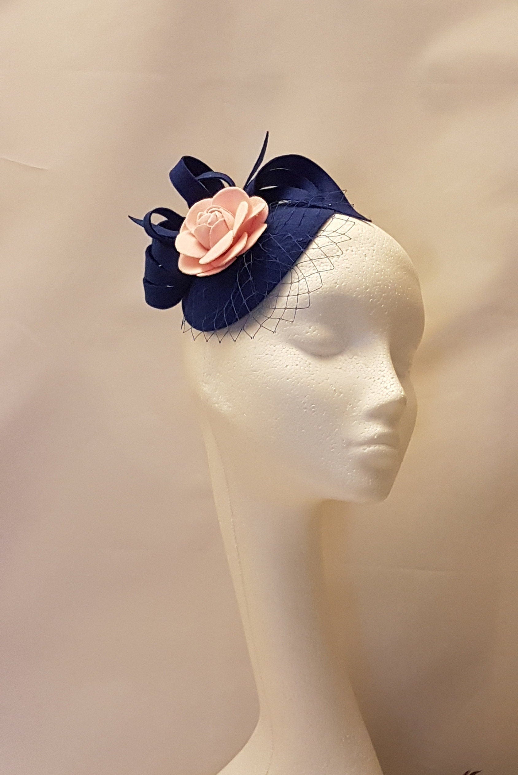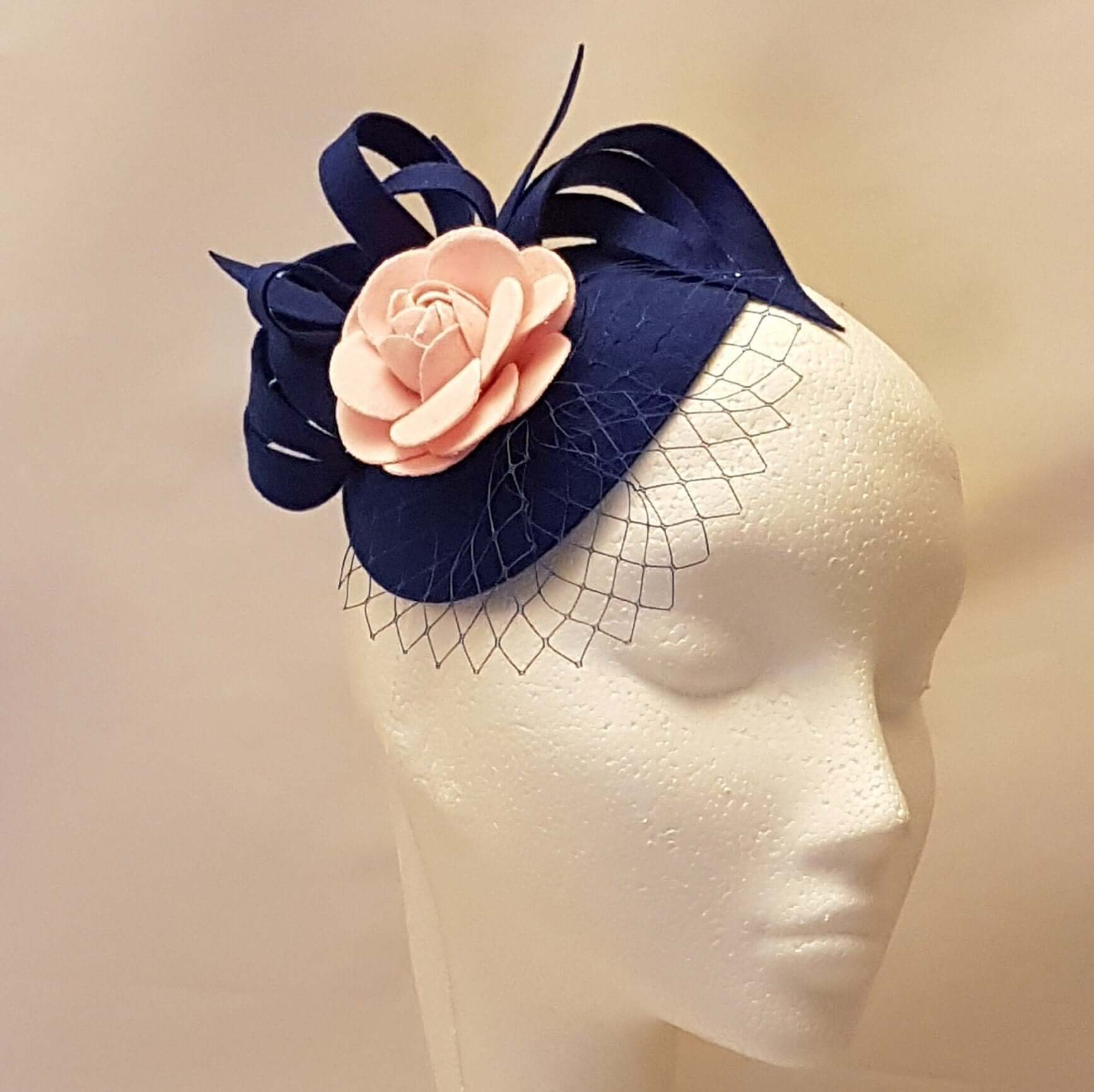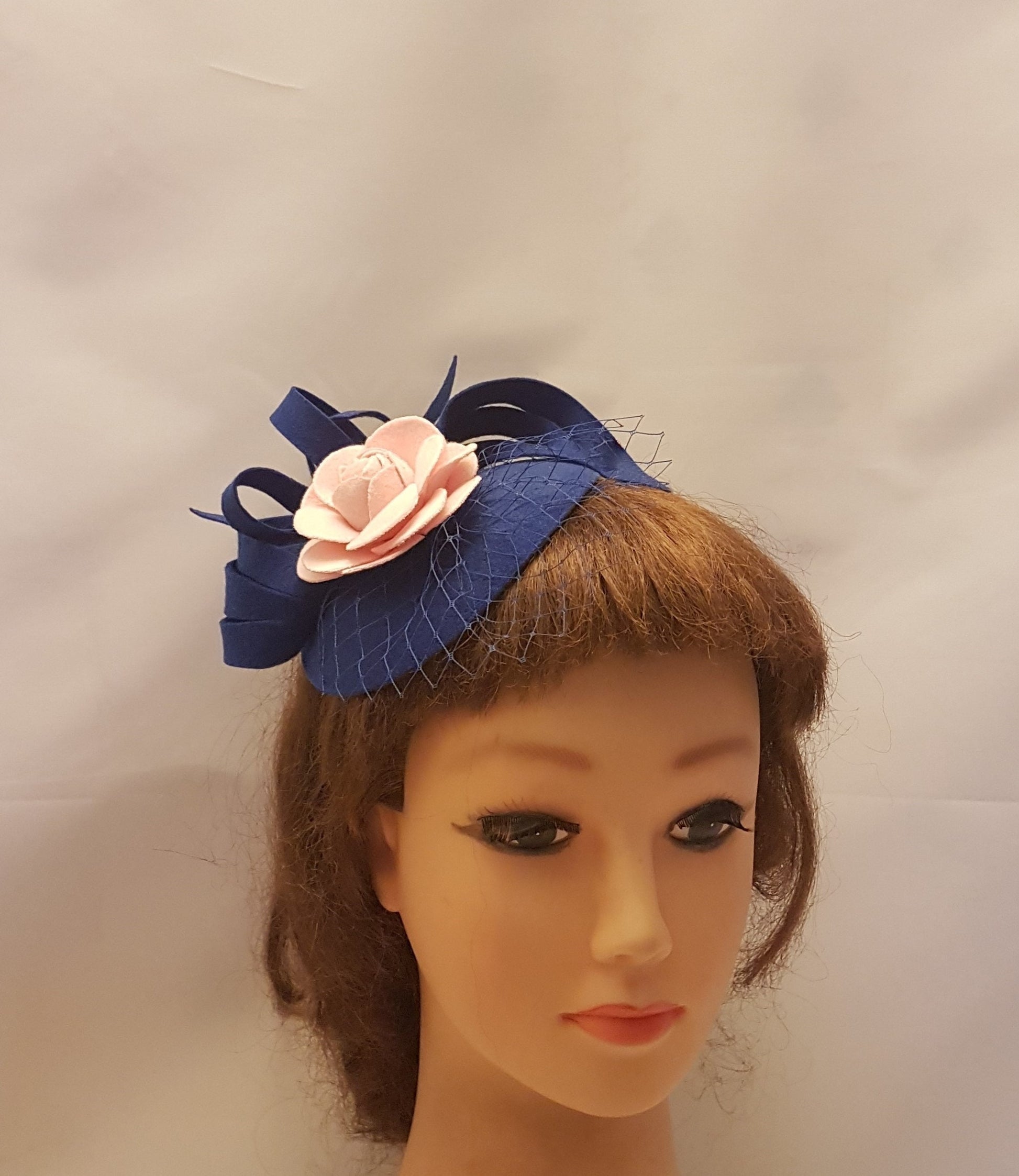 Fascinator Royal Blue Mini Felt like Teardrop hat Fascinator with Felt Loops French netting mini veil and Pink Felt Rose