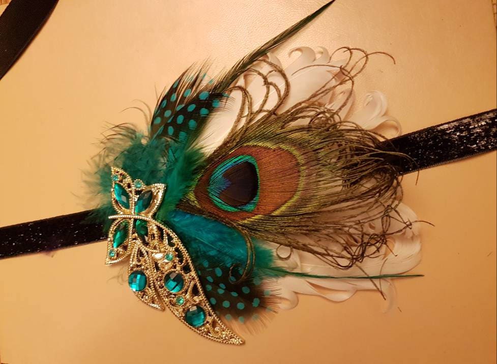 Made of beautiful rooster and peacock feathers adorned with sparkle rhinestones. flapper headband.