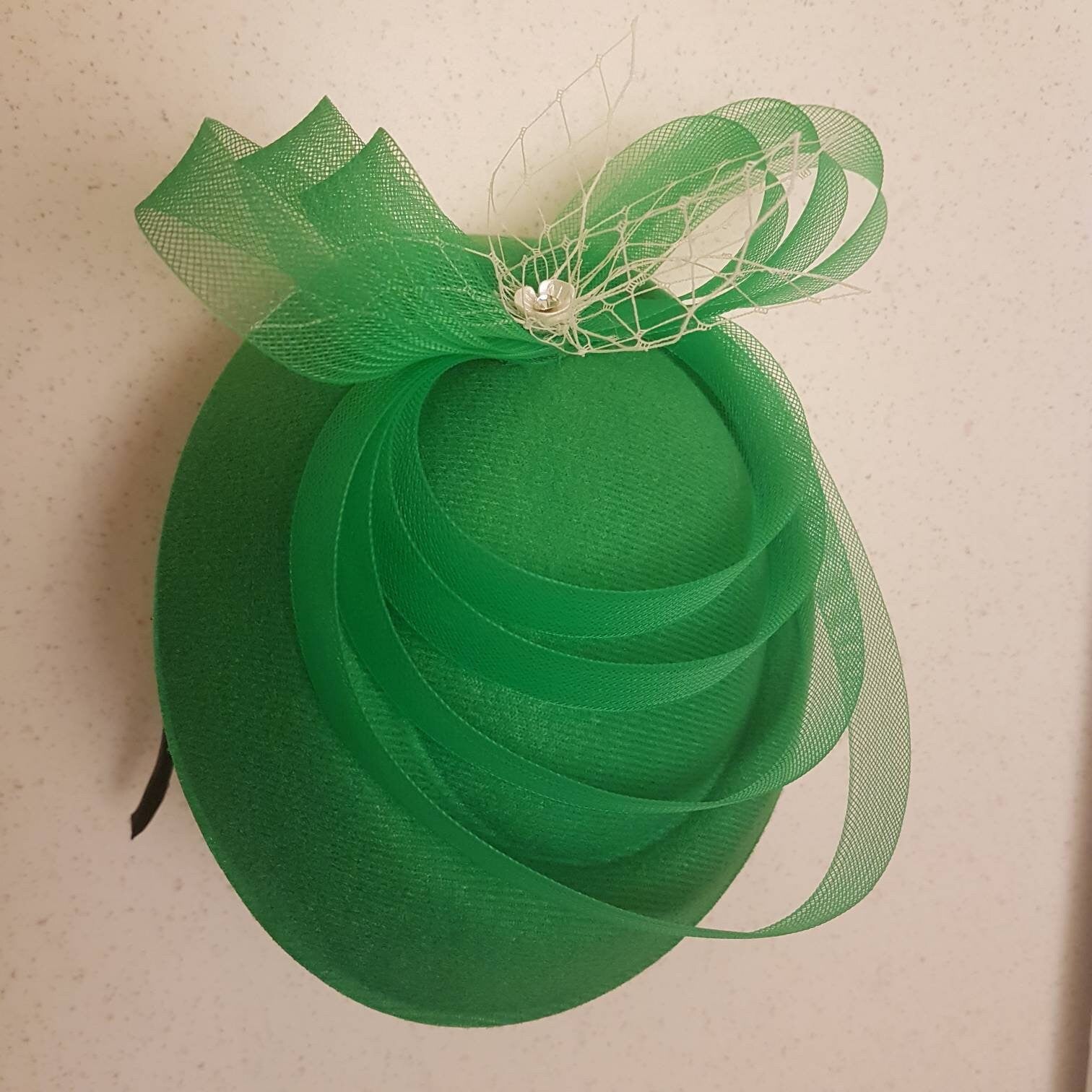 Gorgeous Green Hat fascinator. Green Hat Fascinator with Light green Crinoline bows and loops and French net detail in the centre with mini flower.