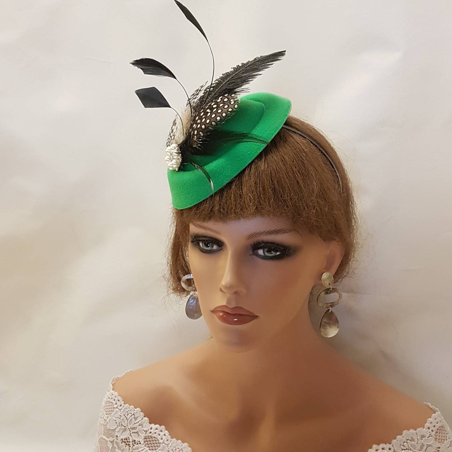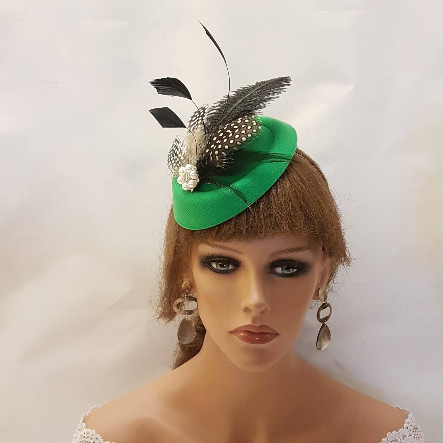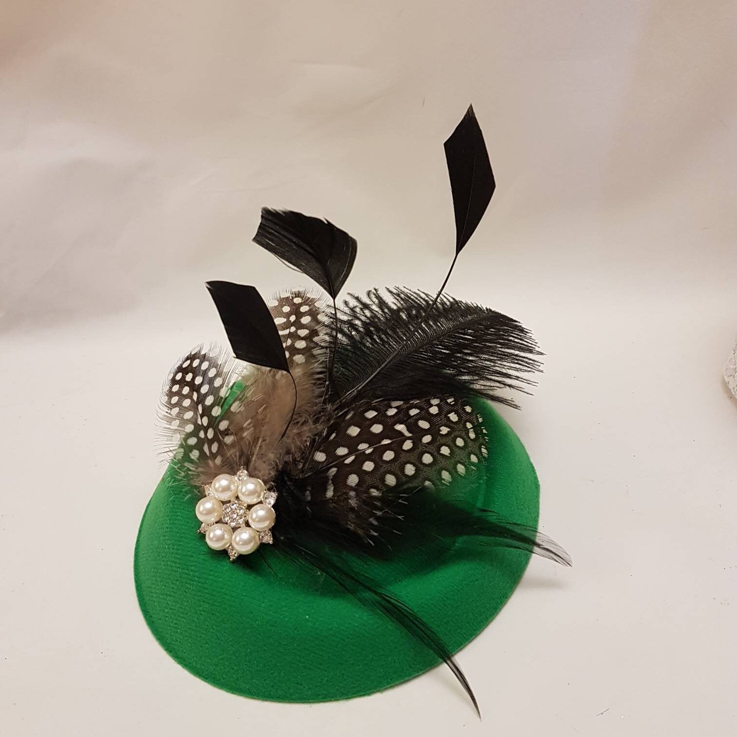 Fascinator, Green Hat fascinator Cocktail, Wedding,Kentucy Derby, Ascot fascinator,Vintage inspired hat fascinator. Wedding, Goodwood revival, Christening, Ascot, Prom , Special occasion hat Party etc..., Gorgeous Hat fascinator. GREEN Hat Fascinator with mix of Feathers This hat has been made by hand and very light to wear. with beautful feathers. Might have slight differences as these are made by hand. Hat Fascinator With assorted feathers of Ostritch ,and beautiful touch of Natural Guinea Fowl Spot Feathers and rooser feathers and a sparkling Pearl/ rhinestone jewel. Attachment option: Aligator clips with teeth Headband or Comb Hat size - approx 6 inch around This can be worn from centre to a side part or middle part or accross the head or even with a birdcage veil options are endless with one of your own styles. Perfect for wedding , Race and ceremonies This is available mostly other colours.