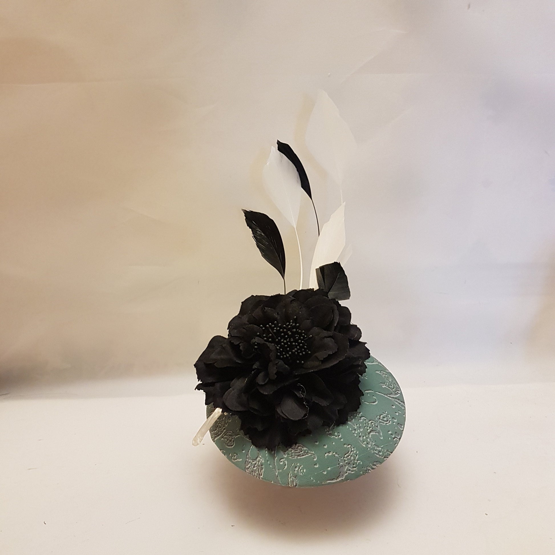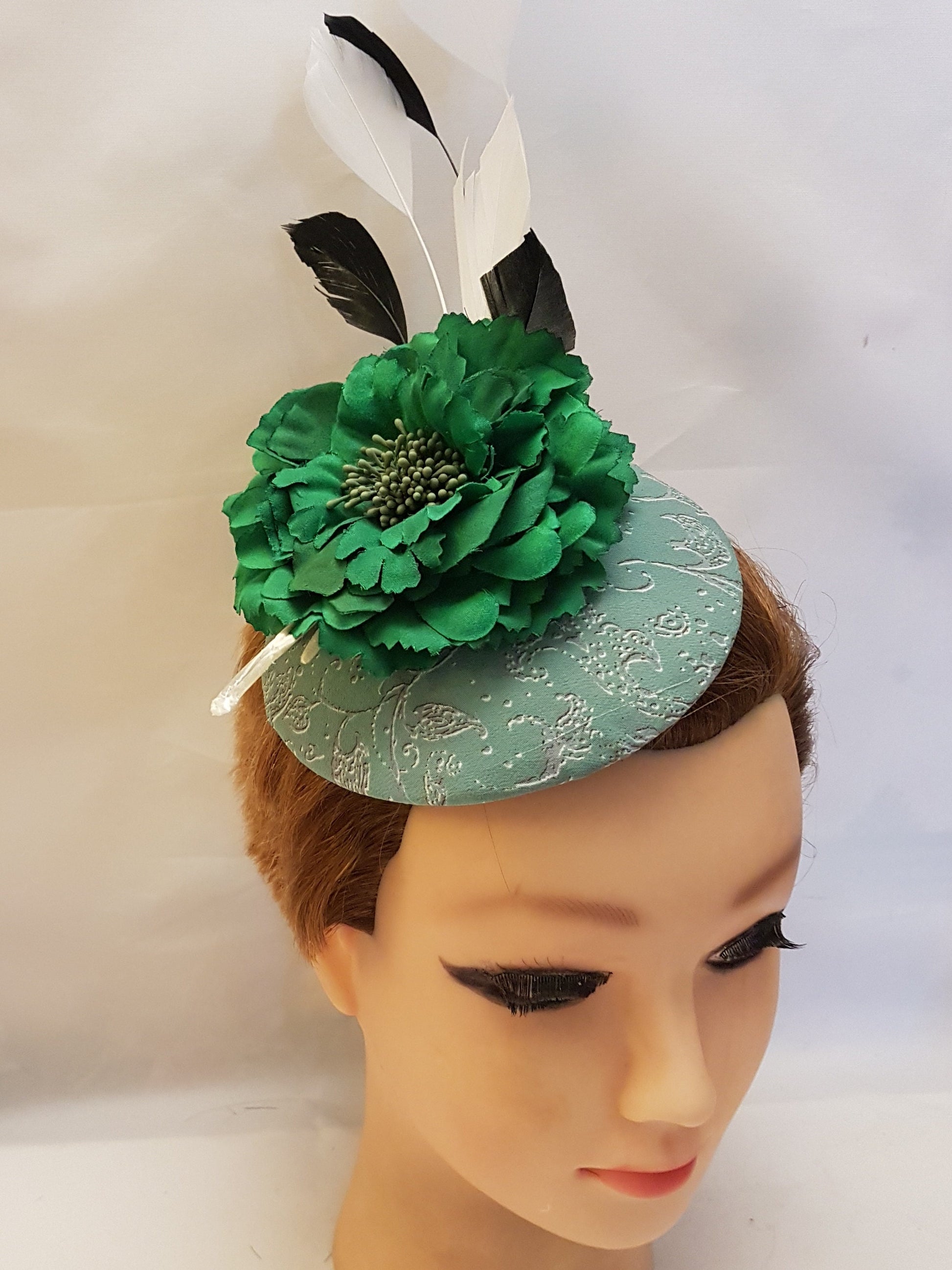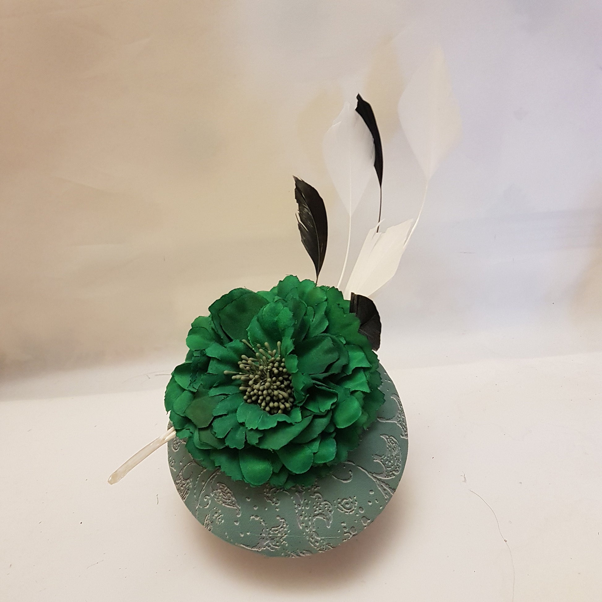 Green Hat Fascinator. Wedding, Ceremony, Mother of Bride or Groom, Ascot fascinator, Vintage inspired hat fascinator. Wedding, Goodwood revival, Christening, Ascot, , ceremoney,Prom Christmas Party etc..., Gorgeous Moss Green Hat fascinator with Green Flower and black and White feathers This hat has been made by hand and very light to wear. Feather detail for a beautifull Glamorous look. Attachment option: Alice band - Black satin covered metal headband or Alligator clip Hat size - approx 13 cm Round Flower size - 11 cm If you need that special little headpiece for your vintage event, the Races or a Wedding then this one could be for you! This can be worn from centre to a side part or middle part or even with a birdcage veil. options are endless with one of your own styles. Please Visit my shop for more Vintage birdcage veils ,fascinator hats and gatsby headbands etc...