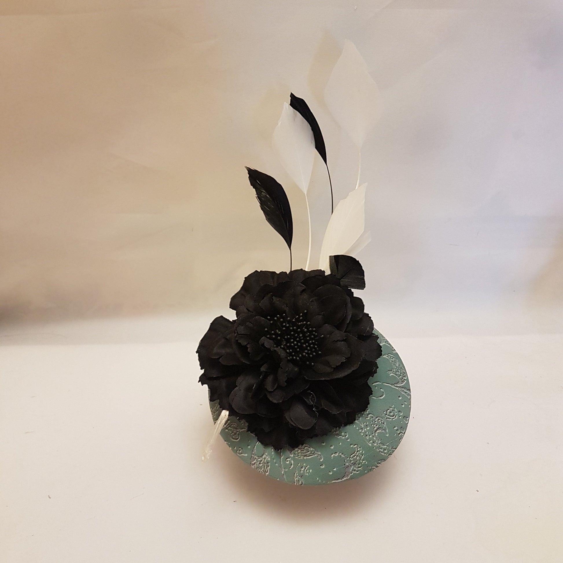 GREEN HAT Fascinator MOSS Green Print Hat Flower Hair Fasinator Black & White FeatherHatinator Wedding Ceremoney Hatinator Ladies Ascot Hat