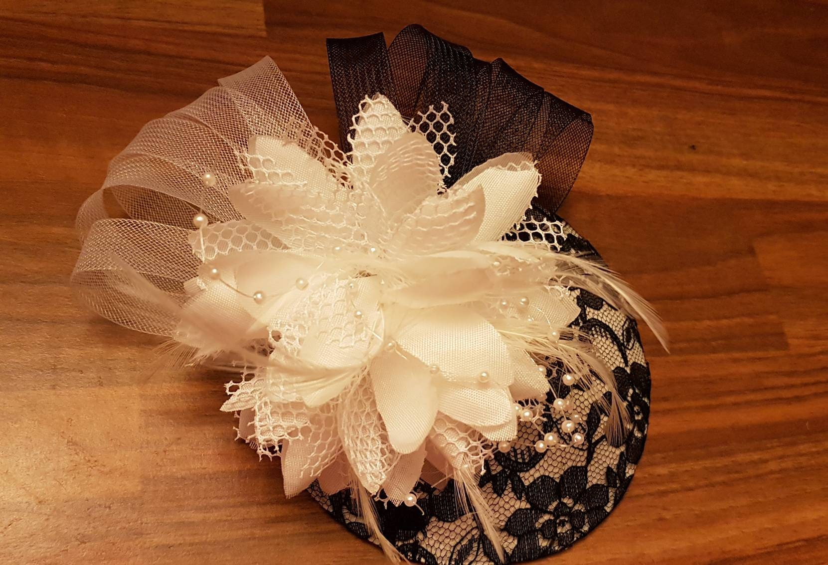 Hat Fascinator Black lace covered fascinator hat with Black or White beautiful feather flower and crinoline loops Vintage Style. Can be mounted on aligator clips or Black satin covered aliceband Perfect for a vintage inspired bride, 1920's wedding or Great Gatsby theme party or any special occasions.This is gorgeous hair jewelry is a Perfect headpiece for any glamorous bride and for special occassion. Vintage Inspired Wedding Bridal headpiece. Hat round measures 17 cm/6.7 inches Please Visit my shop for more birdcage veils and hats